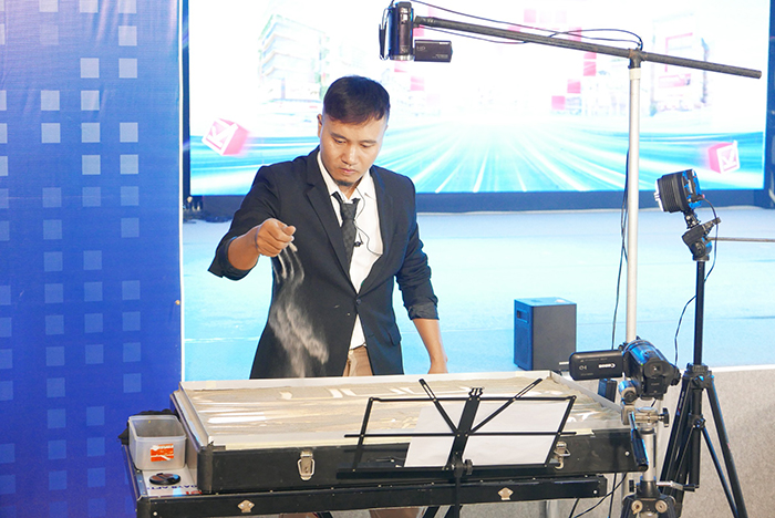 Họa sĩ Nguyễn Tiến đang trình diễn tác phẩm tranh cát biểu diễn